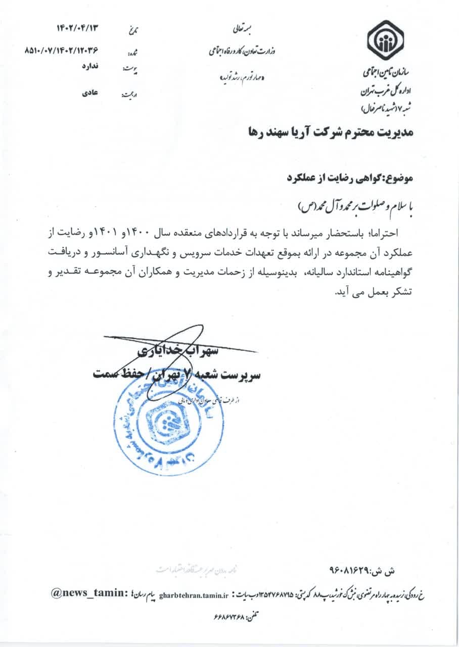 رضایتنامه سازمان تامین اجتماعی شعبه 7